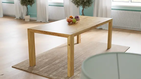 Die Bana Tischplatte wird von zwei auf Gehrung gearbeiteten Profilen getragen. Die optische Plattenstärke von 8 cm wird von dem rechteckigen Beinprofil aufgegriffen und führt so zu einer durchgehenden Linienführung. Quadratische Beinprofile (11x11 cm bis 14x14 cm) sind auch möglich, reduzieren jedoch das lichte Maß an den Stirnseiten. Durch eine 0,5 cm großen Fuge zwischen Beinen und Platte scheint die Platte zwischen den Profilen zu schweben.
