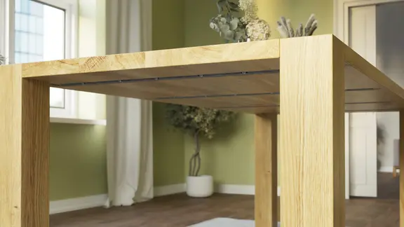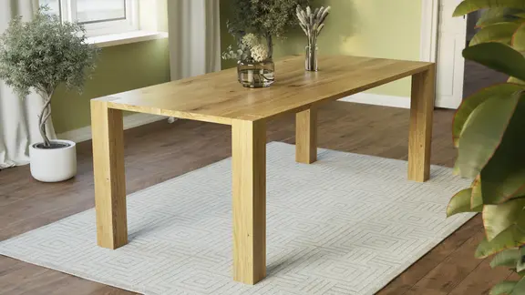 Die Tischplatte des Bos hat eine Stärke von 4 cm. Das reduzierte Design des Bos kommt vollständig ohne stützende Rahmenkonstruktion aus – natürliche Schlichtheit in Perfektion. Bei großen Tischen wird ein stützendes Seilsystem unter der Tischplatte benötigt. Die kräftigen Beine des Bos stoßen durch die Tischplatte hindurch und bilden einen spannenden Kontrast zur Platte.