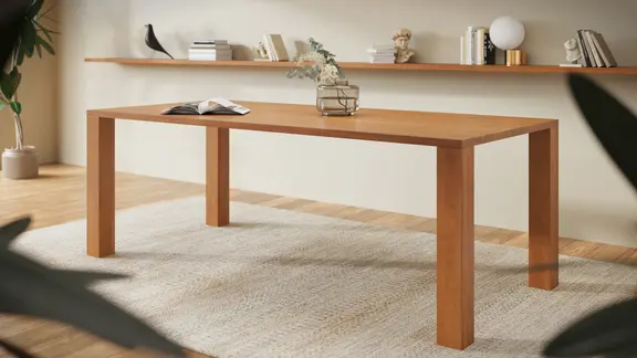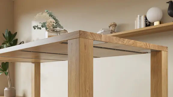 Die 4 cm starke Tischplatte des Cos scheint geradezu nur auf den Beinen aufzuliegen. Das reduzierte Design des Cos kommt vollständig ohne stützende Rahmenkonstruktion aus – Schlichtheit in Perfektion. Ab einer Länge von 210 cm wird der Tisch mit einem Seilspannsystem unterstützt.