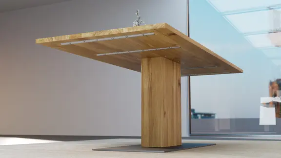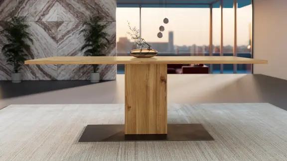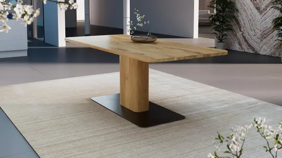 Das Tischmodell Milas kann wahlweise mit einer 4 cm starken Platte oder als Rahmenbauweise mit 6/8 cm Stärke konfiguriert werden. Die 4 cm starke Tischplatte kann längsseitig optional mit einer natürlichen Baum-Optik gesäumt werden. Getragen wird die Tischplatte von einem Massivholz-Stahl-Sockel. Die Bodenplatte besteht aus Schwarzstahl und kann optional mit Edelstahl verblendet werden. Durch seinen Mittelfuß ist der Milas perfekt für eine Tisch-Eckbank-Kombination, ist aber natürlich auch für eine klassische Bestuhlung geeignet.