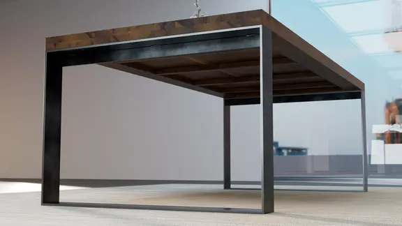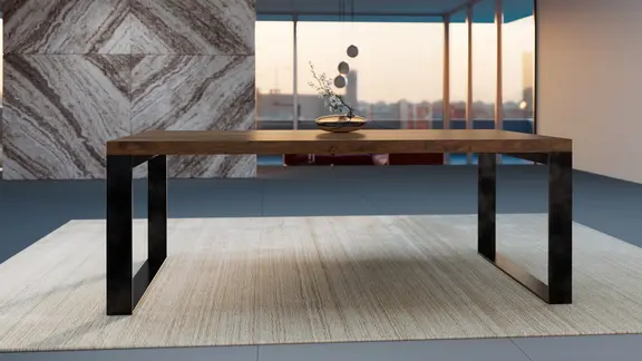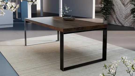 Die optische Plattenstärke von 6 cm wird durch eine 3 cm starke Tischplatte und einem darunterliegendem, 3 cm starken Rahmen gebildet. Die 11 cm breiten Stahlbänder aus Schwarzstahl bzw. Edelstahl bilden längsseitig einen spannenden Materialkontrast zum Massivholz. Auf der kurzen Seite wiederum verschwinden die 1 cm starken Bänder fast gänzlich. Bei Tischen ab einer Breite von 100 cm werden 5 cm hohe Stahlzargen auf der Innenseite der Stahlbänder montiert und sind entsprechend sichtbar.