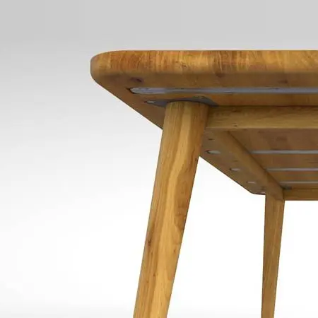 Die 4 cm starke Tischplatte des Themis ist an den Unterkante mit einem Radius von 2 cm abgerundet. Unterstrichen wird das junge Design durch die vier abgerundeten Ecken (Radius 10 cm). Die eingerückte Zargenkonstruktion ist mit 5 cm sehr flach und somit kaum sichtbar. Die runden Beine des Themis verjüngen sich von 10 cm auf 5 cm und sind kopfseitig um 6 cm und längsseitig um 8 cm eingerückt.