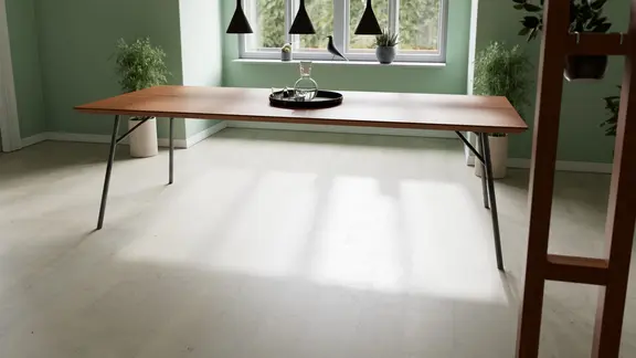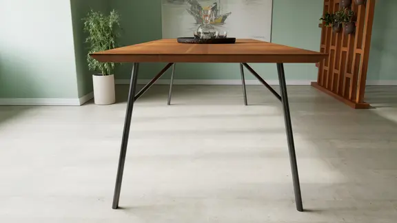 Die Tischplatte des Viana ist 4 cm stark und wird umlaufend mit einer Schweizer Kante gefertigt. Die optische Plattenstärke von nur 0,8 cm passt perfekt zu den filigranen Beinen aus Schwarzstahl. Die nur 3 cm starken Rohre sind leicht nach innen geneigt.